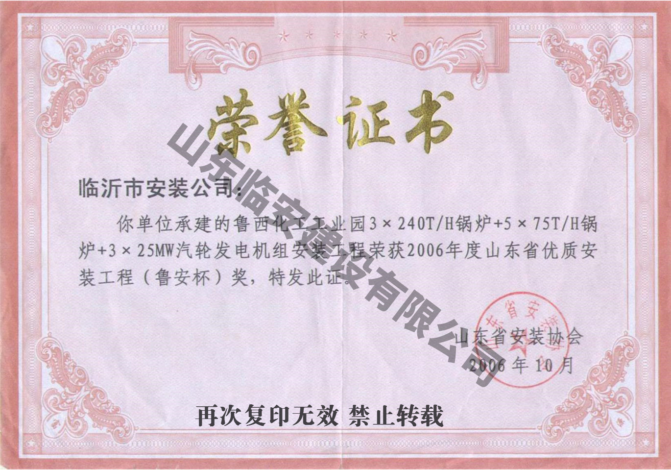山東臨安建設(shè)有限公司(原名臨沂市安裝公司)始建于一九六六年,是由老國(guó)企改制的股份制企業(yè),公司總部位于羅莊區(qū)通達(dá)路211號(hào),現(xiàn)有職工1000余名,各類工程經(jīng)濟(jì)技術(shù)人員816名,其中高中級(jí)職稱64名,初級(jí)職稱204人。主要從事機(jī)電工程施工總承包,電力施工總承包,石油化工施工總承包,建筑裝飾裝修施工總承包,鍋爐安裝、改造I級(jí)(參數(shù)不限),GB1、GB2(2)級(jí)、GC1級(jí)、GD1級(jí)壓力管道安裝,起重機(jī)械B級(jí)安裝,電力設(shè)施承裝、承試,并取得了GB/T19001-2008質(zhì)量管理體系認(rèn)證證書、GB/T28001-2011職業(yè)健康安全管理體系認(rèn)證證書、GB/T24001-2004環(huán)境管理體系認(rèn)證證書,資信等級(jí)“AAA”級(jí)。